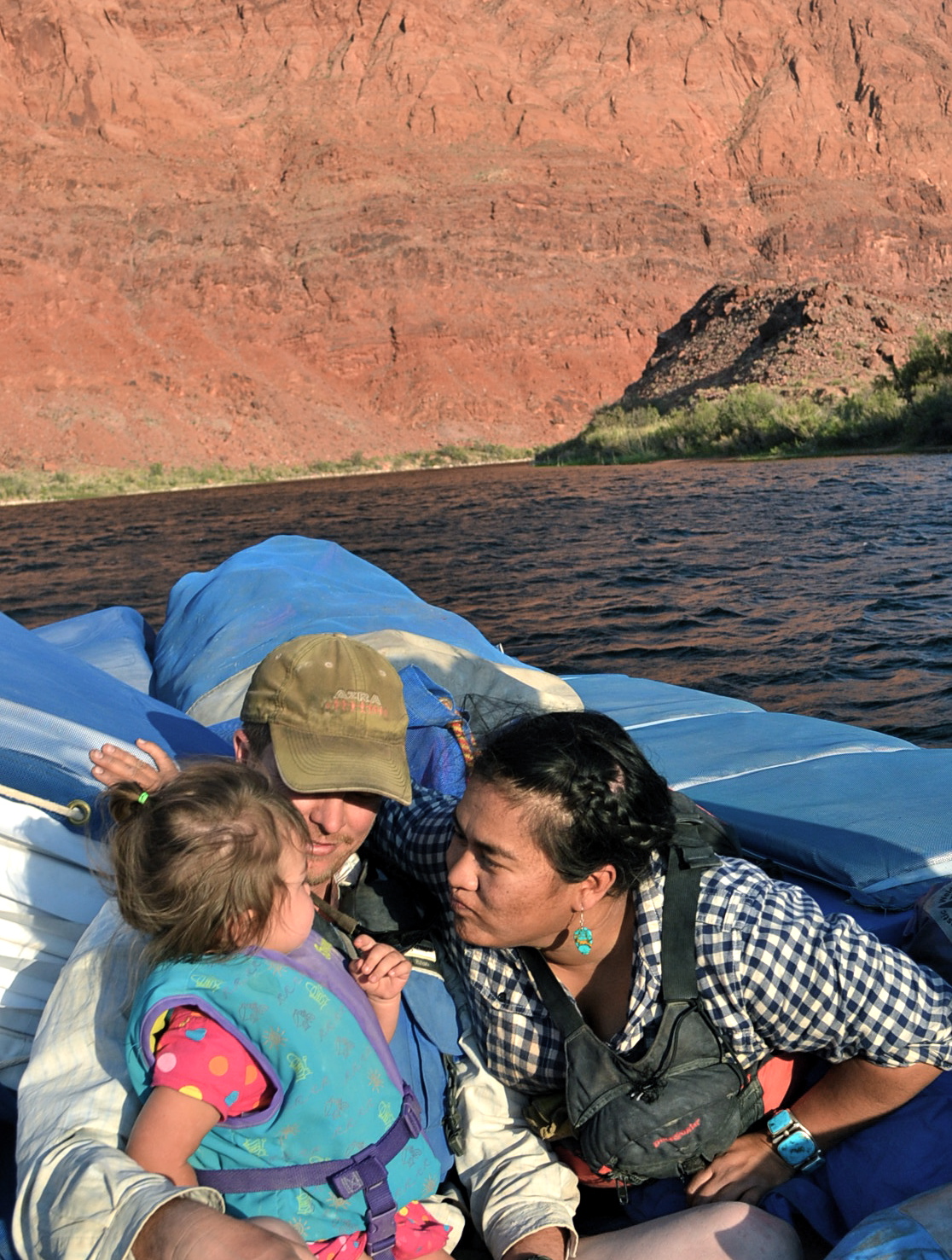 This is a photo of my family; my daughter, husband and I. We are sitting atop a 32 foot motor boat and the view behind is of the Colorado River and of Marble Canyon. It is an upstream view from Lee’s Ferry where private and commercial river trips launch their multi-day river trips down the Colorado River and into Marble Canyon and eventually into the Grand Canyon. The photo was taken this past May and it is the day before my husband and I launch on an 8 day river trip with a group of folks from Road Scholars. It is a very special day because it is my daughter’s first boat ride. It is her first and most likely not her last time atop a boat (motorized or raft powered) on a river in the southwest. She is wearing a life jacket that I found at the local Goodwill store and paid $5.99, and I was delighted to see the remnants of what seemed like San Juan River mud caked to the jacket. It was an indication that the previous wearer of the jacket used it to its full potential until he or she grew out of it. And that is what I hope for my daughter – to use the jacket as much as she can on river trips and learning to enjoy and respect water.